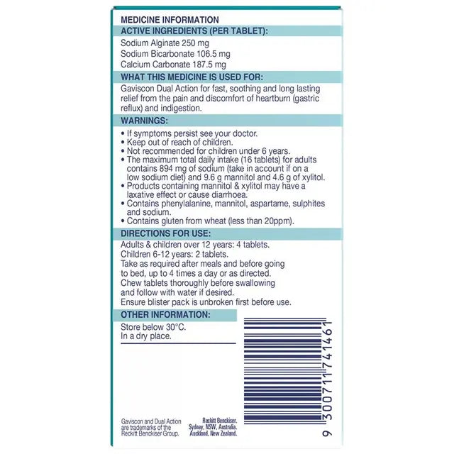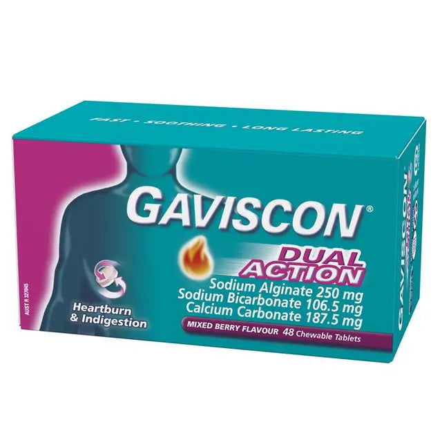 Gaviscon Dual Action Chewable Tablets Heartburn and Indigestion Relief Mixed Berry 48 Pack