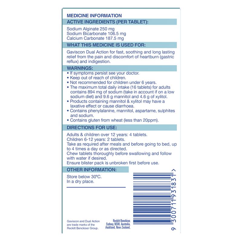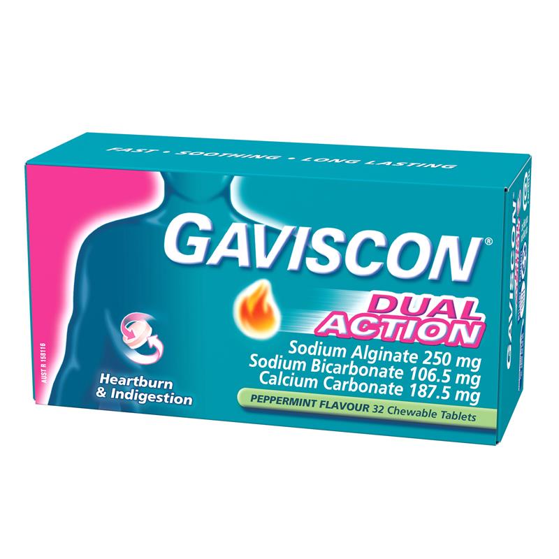 Gaviscon Dual Action Chewable Tablets Peppermint Heartburn & Indigestion Relief 32 Pack
