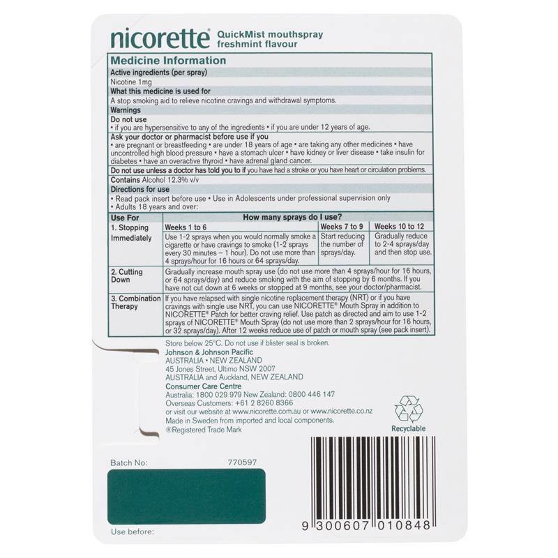 Nicorette Quit Smoking QuickMist Nicotine Mouth Spray Freshmint 150 Pack