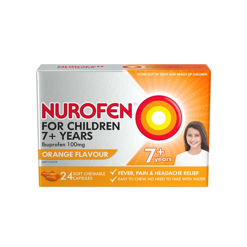 Nurofen For Children 7+ Pain and Fever Relief Chewable Capsules 100mg Ibuprofen Orange 24 pack