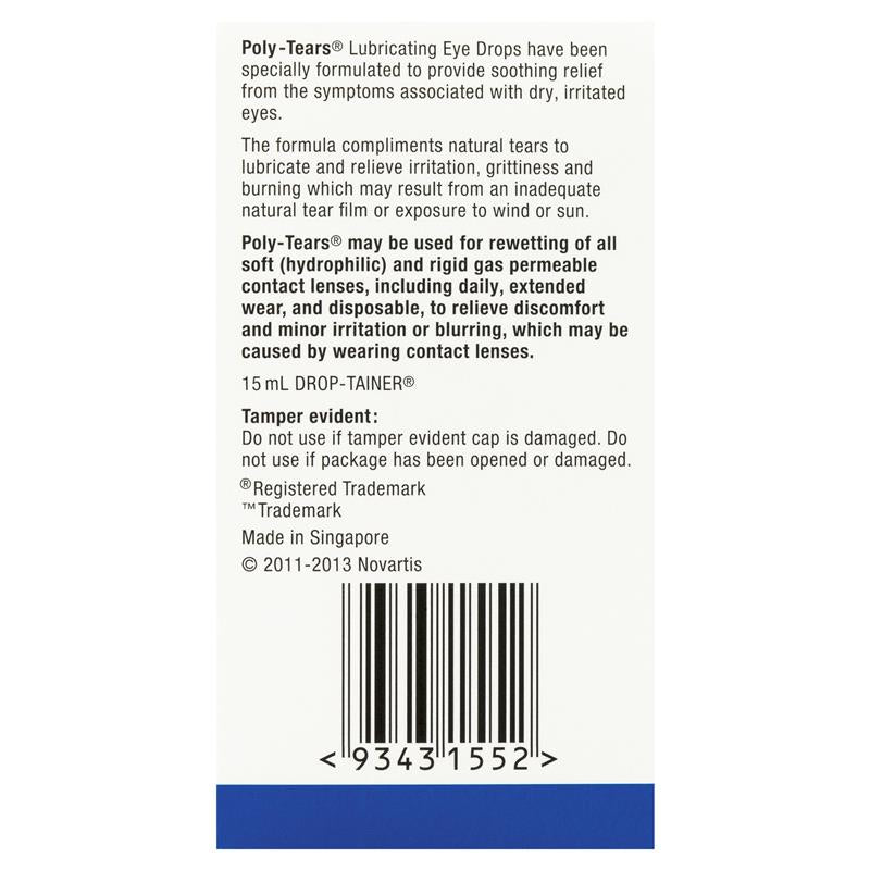Poly-Tears Lubricating Eye Drops have been specially formulated to provide soothing relief from the symptoms associated with dry, irritated eyes.